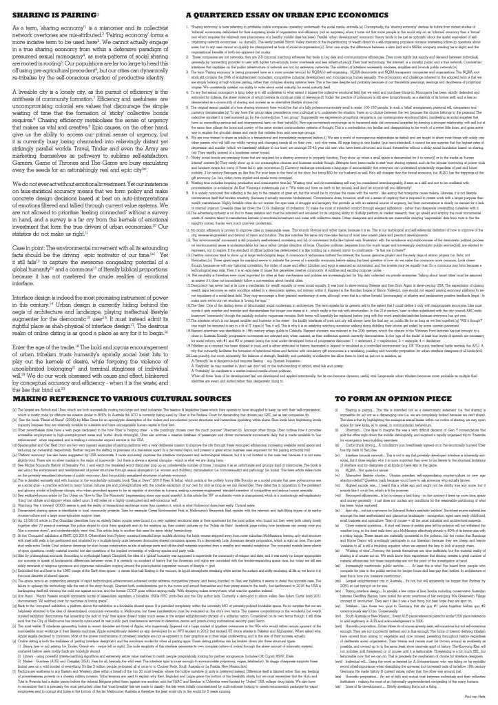 Sharing Is Pairing is a long-form written work exploring the unspoken desirous drivers of consumerist urbanism. It begins as a takedown of the so-called ‘sharing economy’, drawing links between economic structures of monogamy, myths of statistical efficiency, the value of communitarian wastefulness, and testing the idea of the city as an ’emotional interface’.