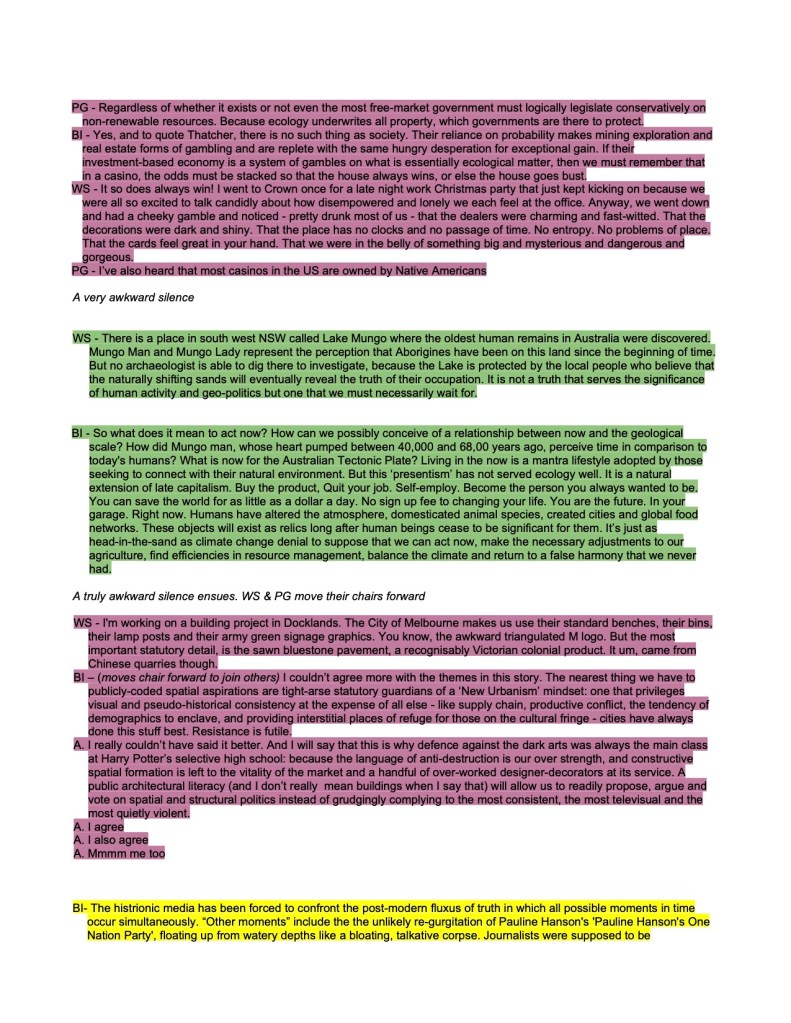 Looking for Love was a spoken-word performance based on the themes and provocations of the written work Sharing Is Pairing. It was structured as a trialogue of effusive accord between three irreconcilable political voices, each ‘looking for love’ (that is, epic commitment) within the climate justice movement. It was a critique of micro-ethical accord (e.g. the moral injunction to recycle) and the demonstration of the primacy of affect (how we speak rather than what we say) in navigating pressing political problems and ailing democratic forums.