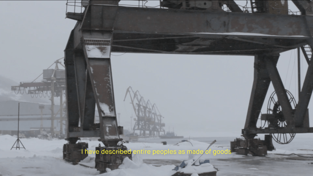 A short speculative film set in the ice of Magadan, Far Eastern Russia, in 2050. An archaeologist explores the frozen wastes of the automated port of Magadan and finds mysterious traces of ‘xeno-feminists’ whose identities and quirks were accidentally frozen into the supply chain decades earlier.