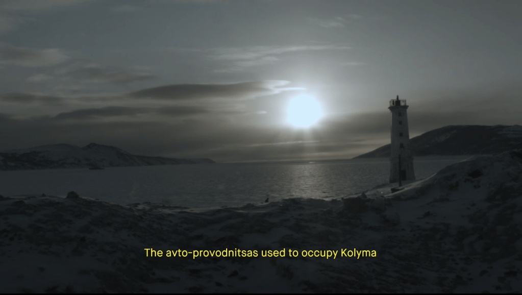 As the xenoboxes were only intended to store localised data about discrete parts of the system, our archaeologist finds only fragmentations of communications and media in the domestic-scale xenoboxes. She hopes to piece together the ethnographic story of the avto-provodnitsas from these clips but instead discovers evidence that their collective impact on the larger system was much greater and more deliberate than anticipated.The video oscillates between the silence of the now deserted destination node of Magadan and the fullness of the fragmented archives that capture its evolution from a place of extraction to a place of archive. It emerges from statistical and interview-based research into port automation and the global inversion of gender patterns in supply chain employment.