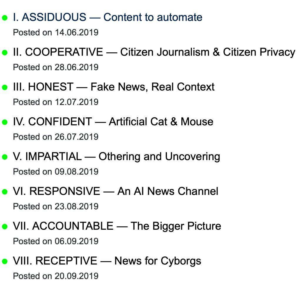 Research essays and a summary article that outline the automating techniques being deployed in the immediate future of mainstream news, including AI content-checking and fabrication, user-generated content sorting, and breaking through filter bubbles.
