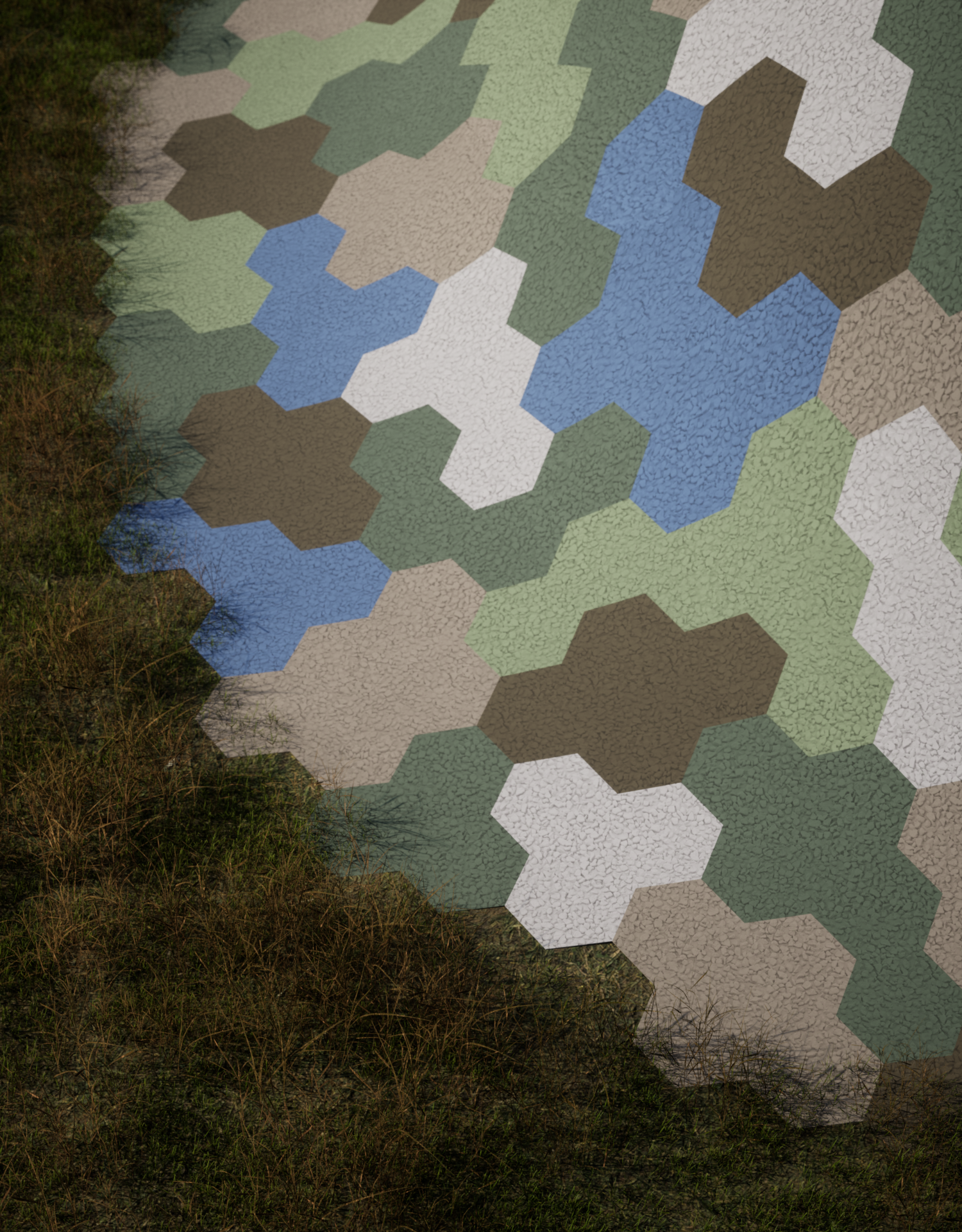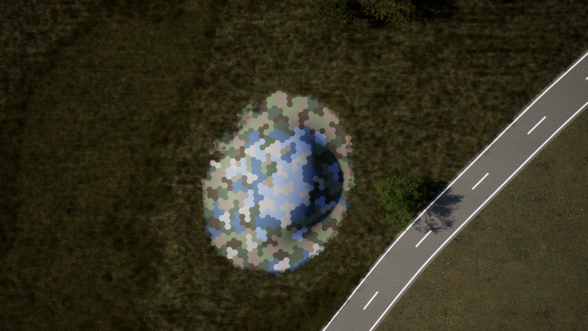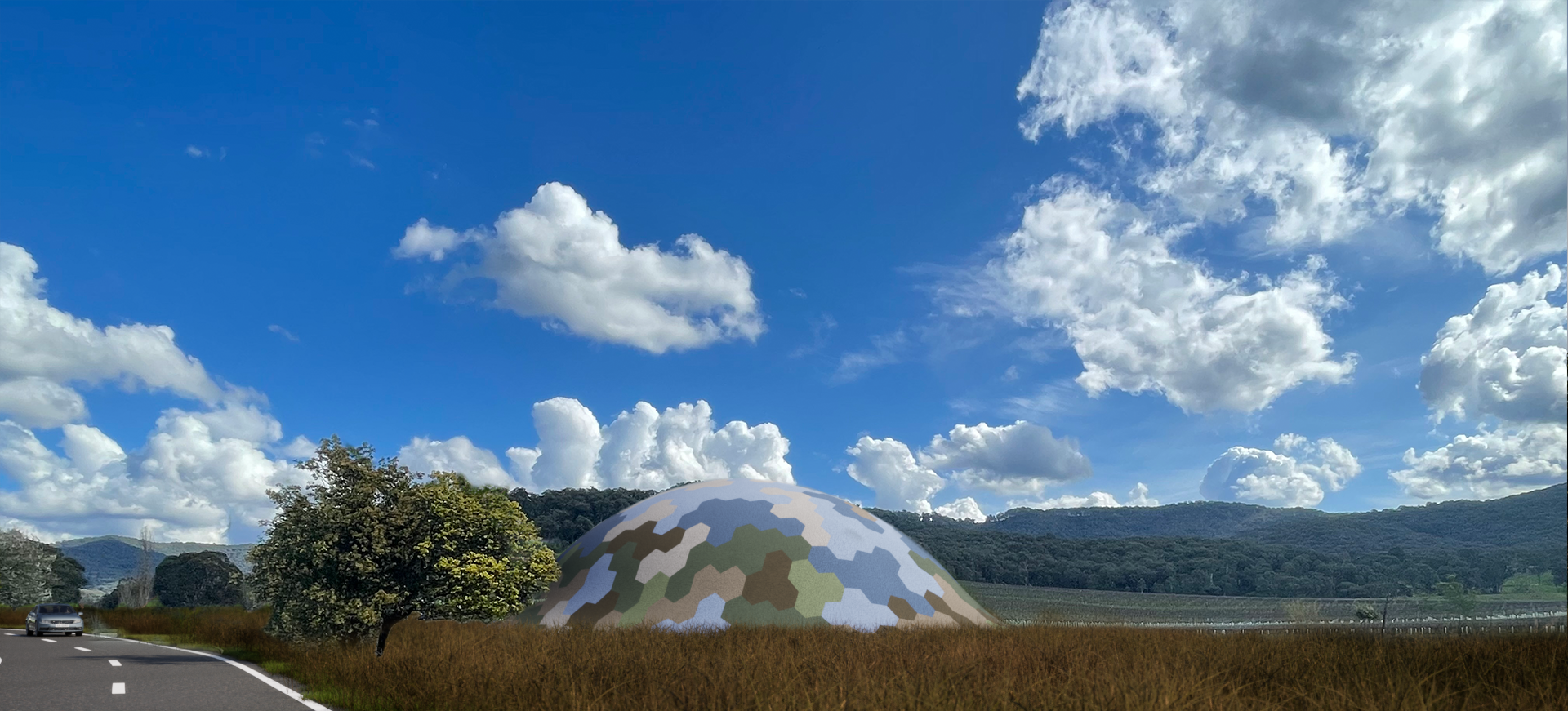 The proposal’s surface is a camouflage pattern that samples the colours of the surrounding landscape, so that in its attempt to fit in it creates a strange palette of the valley stretching beyond in both directions. It becomes an impressionistic device through which to understand the colours and textures of the King Valley’s landscape, at the resolution of an outsider’s perspective.