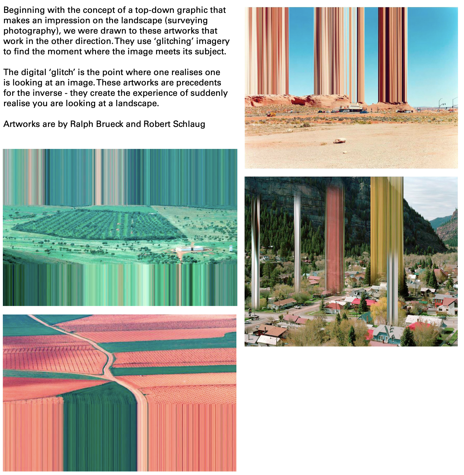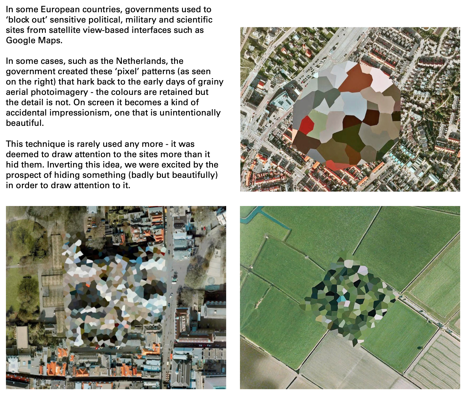 This question took us through the history of aerial surveying and satellite imaging for extractive industries including agriculture, mining and defence. These relatively recent practices have left many amazing landmarks on the surface of the earth, though how they appear and linger on the ground has an extended impact on the ground to locals who live among them. We were also drawn to contemporary digital domains, like pixelated camouflage patterns that hide secret and sensitive locations around the world on google maps, creating an intriguing paradox: by trying to hide, they draw attention to their importance. It is this attitude which drives our concept: drawing attention to the Whitfield and the King Valley by appearing to be (badly) hiding something highly valuable in plain sight.