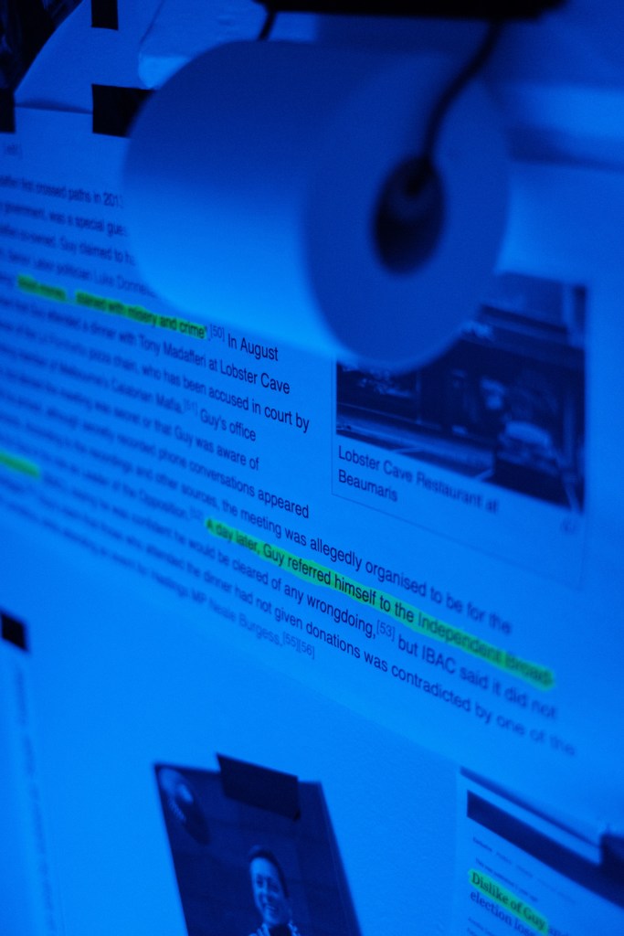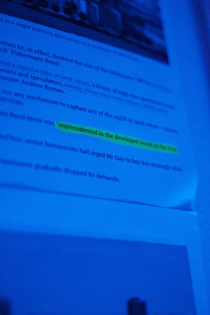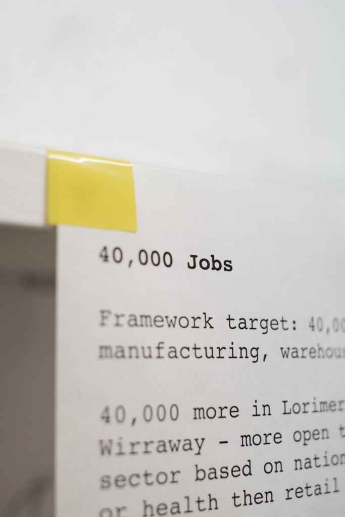 Using a paranoid whodunnit method, the main buzzwords promoting Fishermans Bend are treated as the prime suspects in its murder; starting with clues about where stated good intentions don’t match observed outcomes on the ground. Development, Master Plan, Transport, Innovation, Housing, Activation, Jobs and Waterfront are subject to interrogations in separate rooms of Weston Court.